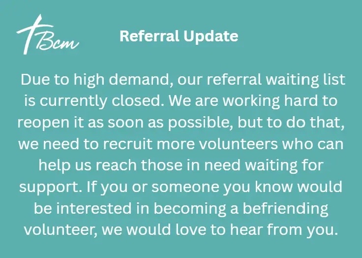At BCM, we believe in the power of companionship and the positive impact it can have on individuals’ lives. Our Befriending Scheme is designed to provide support and friendship to those who feel isolated or lonely. Our dedicated volunteers are here to offer a listening ear, companionship, and a friendly face.
